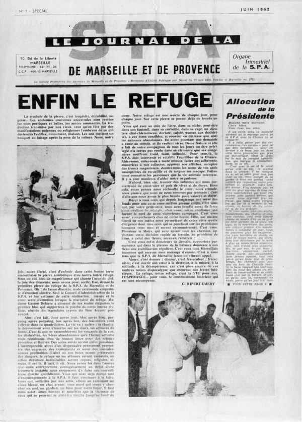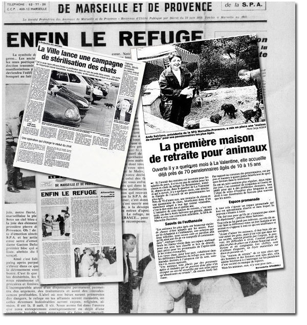 Monsieur Gaston DEFFERRE, SENATEUR MAIRE DE MARSEILLE, consent à la location d’un terrain pour la construction d’un Refuge, derrière les abattoirs. Il n’y pas encore de chauffage, mais il y a de l’eau, des fleurs et du courage. Les Marseillais participent. Ils ‘achètent’ des boxes, une chatterie … ils vont permettre l’édification de cet ouvrage tant attendu prévu pour 72 CHIENS – 40 CHATS. C’est un événement, un soulagement pour les protecteurs de l’époque : parpaing, dons après dons, ils vont créer les bâtiments, aménager les boxes